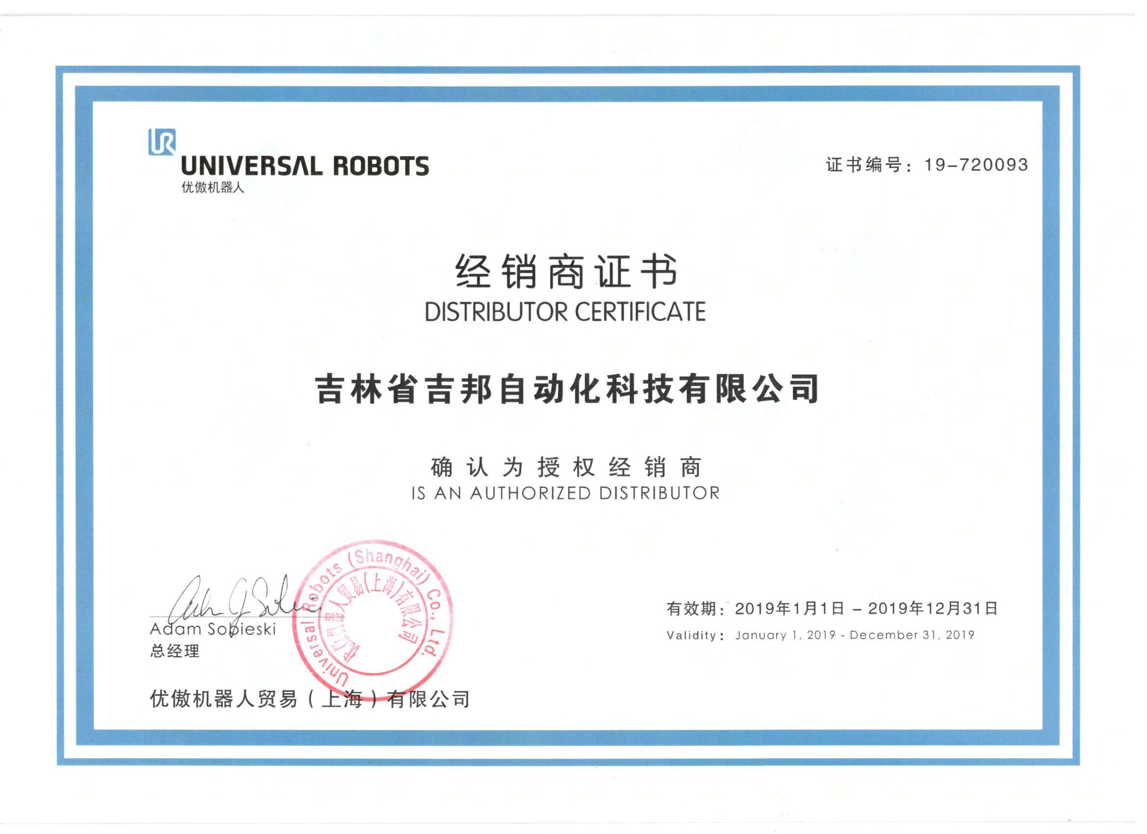 UR機器人經(jīng)銷商證書